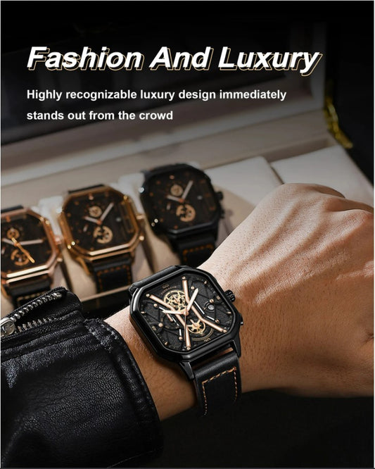 POEDAGAR Luxury Wristwatches Chronograph Leather Quartz Men's Watches - Black Gold